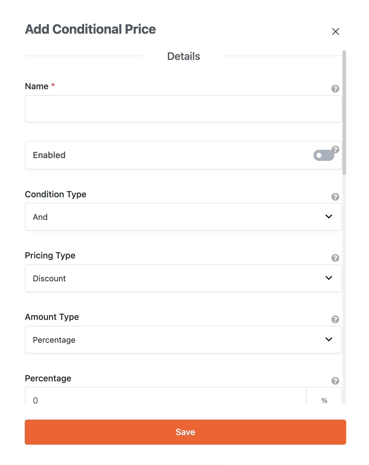 Name – Give your rule a clear name (e.g., “Weekend Surcharge” or “Loyalty Discount”).