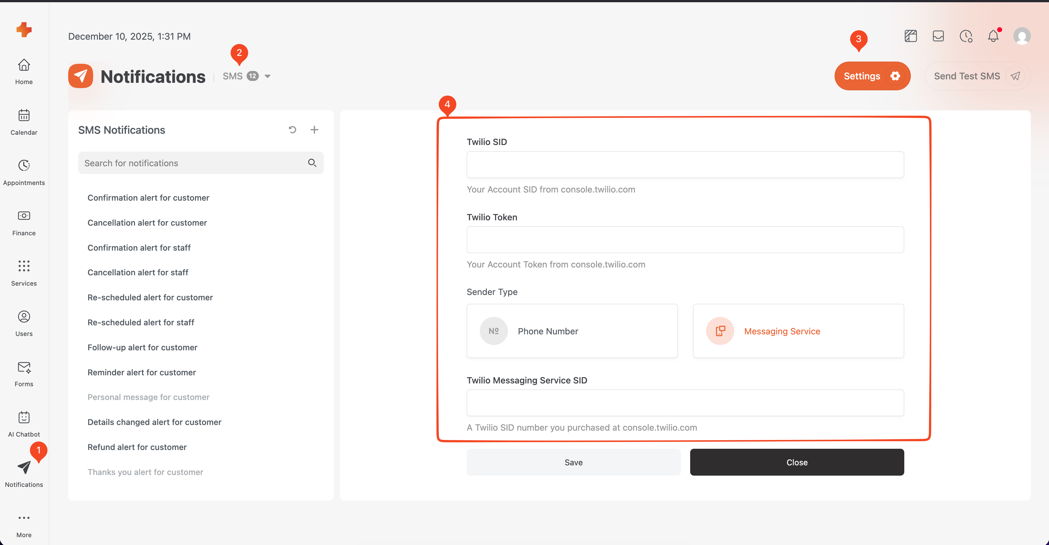 Once your Twilio credentials are saved, BookingHub will begin sending SMS notifications automatically based on the SMS templates you configure.